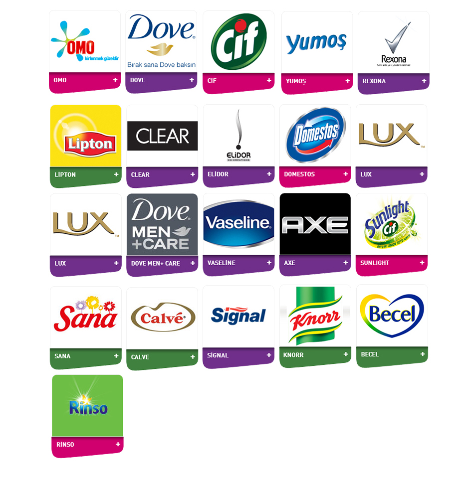 Axe, Becel, Calve, Cif, Clear, Danino, Domestos, Dove, Dovemeni Elidor, Knorr, Lipton, Lux, Omo, Rexona, Rinso, Sana, Signal, Sunlight, Vaseline, Yumoş